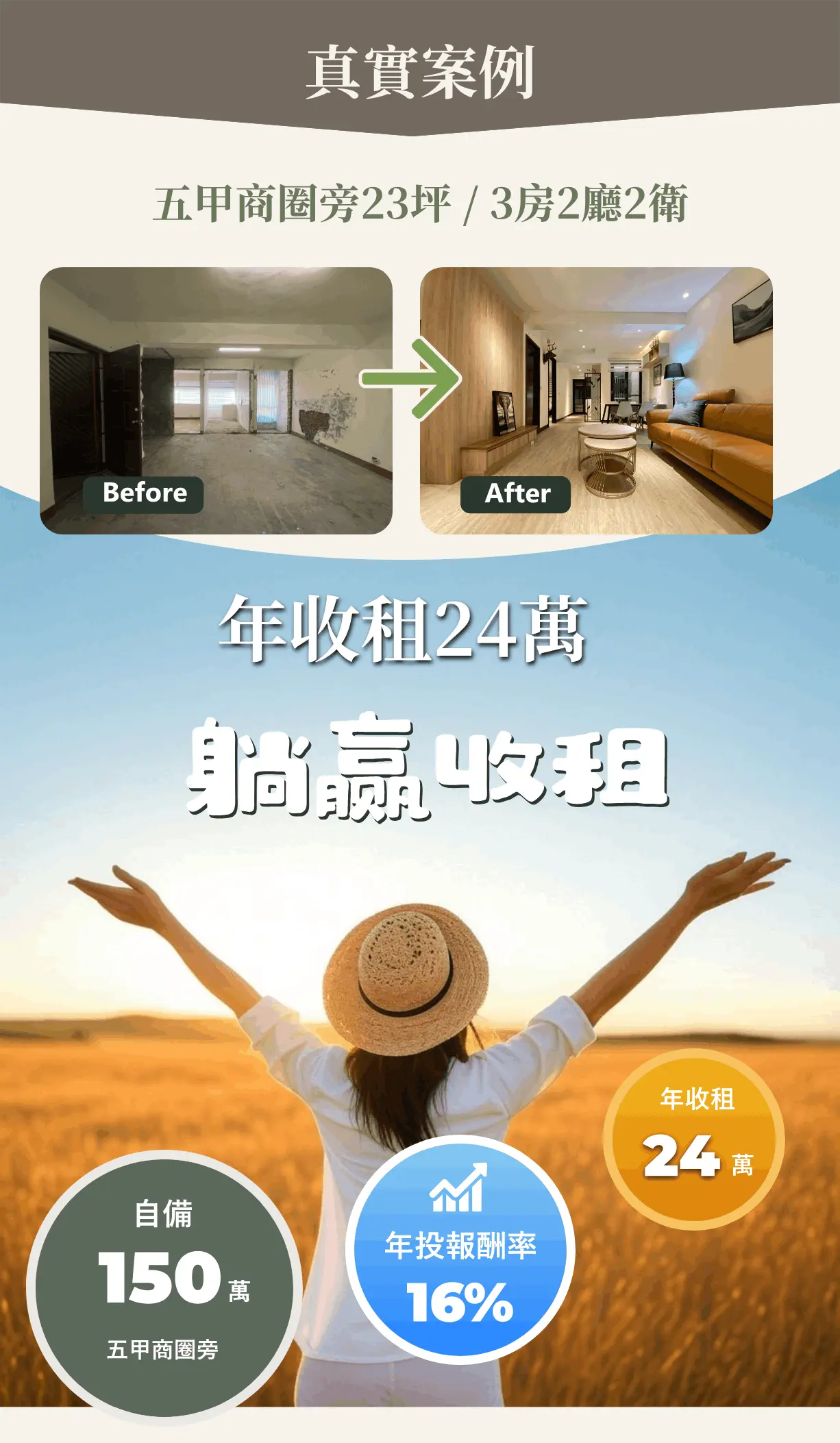 我們相信、老屋承載著時光的故事,新成屋有財富自由的夢想,而「自在」擅長將這些賦予新的⽣命⼒,打造能吸引租客的迷人空間,為您創造穩定且可觀的租金收益